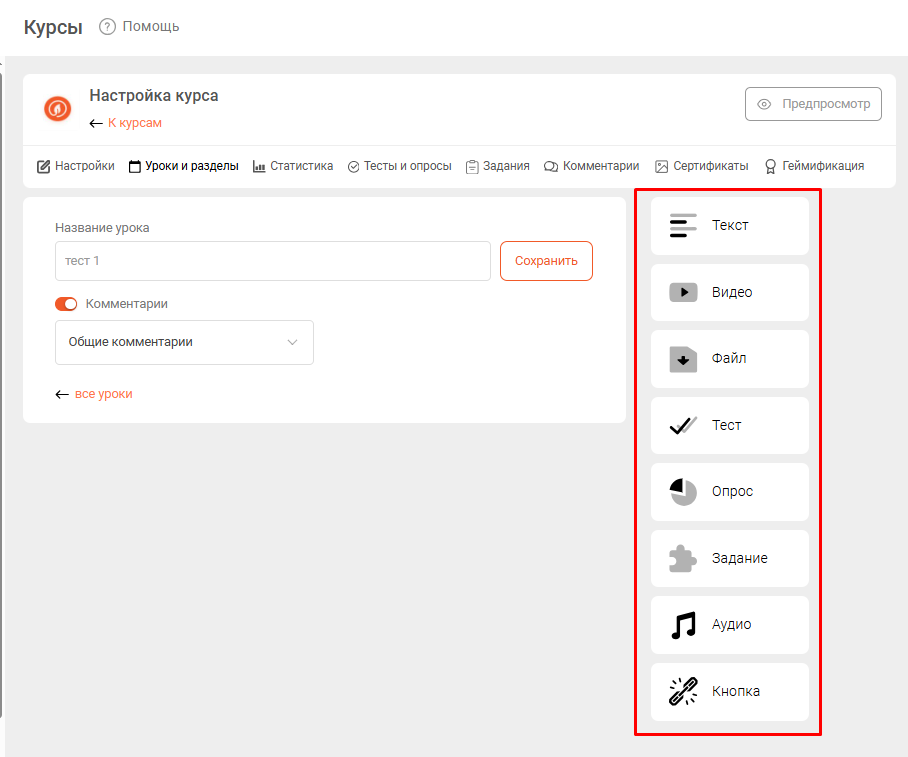 Доступные блоки для вставки в урок вы можете увидеть на панели справа:
